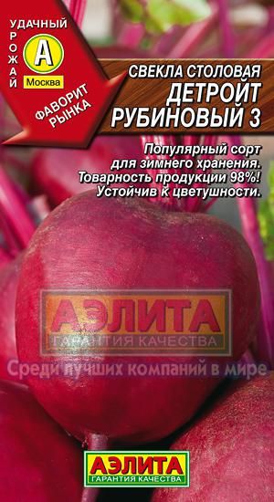 Сорт свеклы столовой Детройт Рубиновый 3, среднеспелый (период вегетации 100-110 дней), включен в Госреестр. Отличается высокой урожайностью (5-8 кг/м.) и отличными товарными качествами. Корнеплоды округлые, массой 250-420 г, с гладкой темно-бордовой кожицей и сочной, плотной мякотью темно-рубинового оттенка. Характеризуется устойчивостью к цветушности и многим заболеваниям, хорошо хранится. Предназначен для использования в кулинарии и переработки. Показатели урожайности стабильны, сорт пластичен к условиям выращивания.