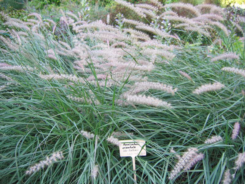 Pennisetum orientale (восточный) – многолетнее растение, образующее густые кусты высотой около 30 см. Листья серо-зеленые, сохраняют свою окраску в течение всего сезона. Соцветия – серебристо-розовые, колосовидные метелки. Относительно низкая холодостойкость ограничивает его выращивание в умеренных широтах. (Вставить фото Pennisetum orientale)