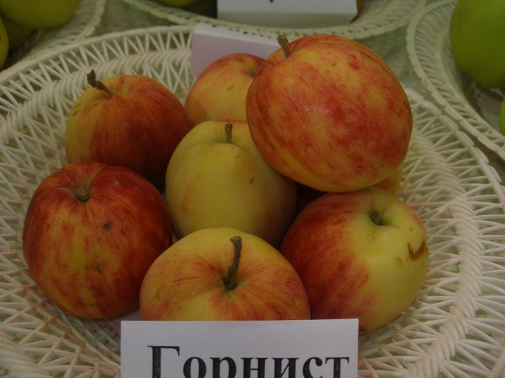 Плоды сорта яблони Горнист характеризуются следующими признаками. Размер. Небольшие, массой 100-110 г. Форма. Округло-коническая, с гладкой, блестящей кожицей. Окраска. Основная окраска кремовая, покровная . темно-красная со штрихами и полосами. Мякоть. Кремовая, крупнозернистая, сочная, кисло-сладкого вкуса. Вкус. Гармоничный, сбалансированный, с приятной кислинкой. Аромат. Слабый, приятный. Лежкость. Невысокая, плоды хранятся в течение 2-3 недель. Плоды сорта Горнист обладают хорошими вкусовыми качествами и подходят как для употребления в свежем виде, так и для переработки на соки, компоты и варенье. По химическому составу плоды содержат.- Сахара . 10-11%