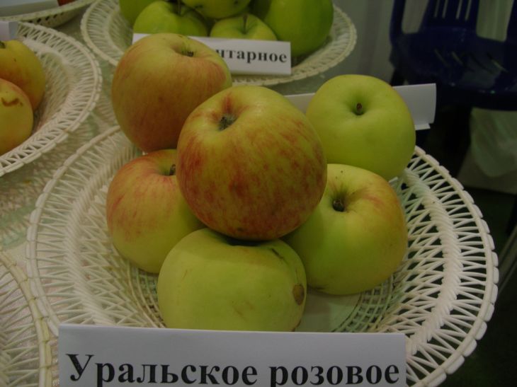 Яблоня Уральское розовое — популярный сорт‚ получивший широкое распространение благодаря морозостойкости и богатому урожаю. Сорт выведен в уральской селекционной станции Л. А. Котовым. Деревья отличаются высокой зимостойкостью‚ нетребовательностью к уходу и устойчивостью к вредителям. Среднерослые‚ достигают высоты до 5 м. Яблоки созревают в конце августа — начале сентября. Плоды средних размеров‚ овальной формы‚ с ярко-розовой окраской. Мякоть нежная‚ сочная‚ с приятным кисло-сладким вкусом и характерными розовыми прожилками. Урожайность высокая‚ с одного дерева можно собрать до 40 кг плодов.Характеристики дерева