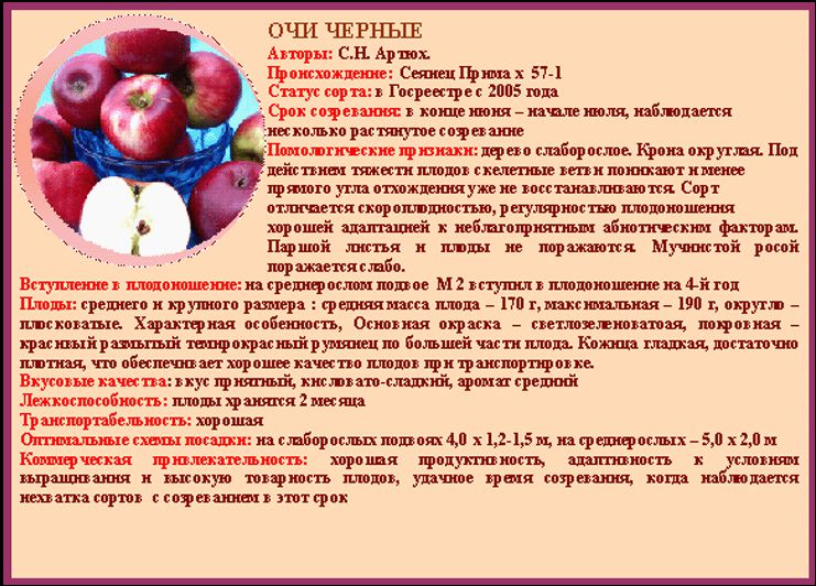Яблоня сорта «Очи черные» характеризуется плодами среднего и крупного размера, округло-плосковатой формы. Основная окраска плодов светло-зеленоватая, покрытая красивым, размытым темно-красным румянцем, занимающим большую часть поверхности. Кожица гладкая и достаточно плотная. Средняя масса плодов составляет 180 г. Плодоножка средней длины и толщины, изогнутая. Сорт демонстрирует среднюю урожайность и лежкость. Более детальные сведения о вкусовых качествах, химическом составе, особенностях выращивания и ухода, а также о специфике применения плодов требуют дополнительных исследований и анализа имеющихся данных.
