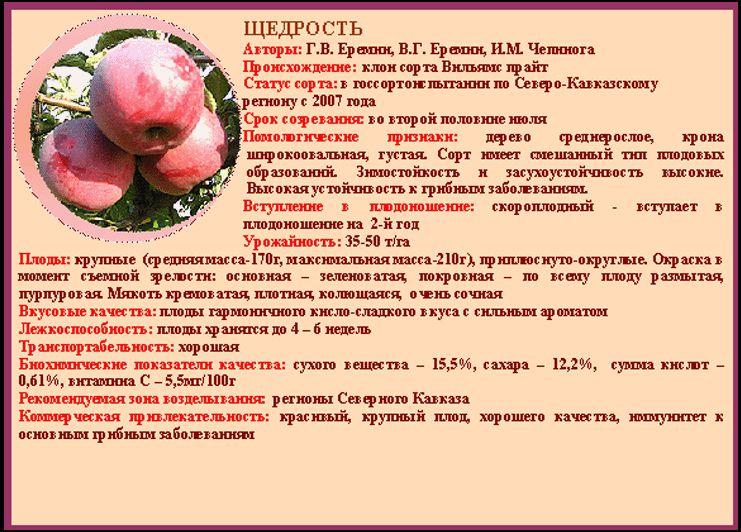 Согласно Госреестру, данный сорт яблонь был выведен на Крымской опытной станции садоводства. Сорт Щедрость является клоном Вильямс Прайт. Данный вид яблок относится к летним. Деревья сорта Щедрость достаточно крупные и быстро растущие. Характерно наличие широкоовальной кроны. Плоды имеют приплюснуто-округлую форму, вес может достигать 210 грамм. Отличительной особенностью яблок является зеленоватая основная окраска и размытый пурпурный покров. Мякоть яблок плотная, кремовая и сочная. Вкус кисловато-сладкий с ярко выраженным ароматом. Яблоки сорта Щедрость можно применять для приготовления самых разных заготовок, включая сок, соусы и маринады.Происхождение и распространение