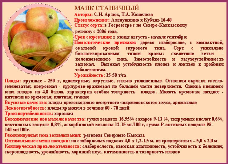 Яблоня «Маяк Станичный» характеризуется крупными плодами, массой от 200 до 270 г, в среднем около 250 г. Форма плодов округлая или усеченно-округло-плоская, с высокой степенью одномерности. Окраска зрелых яблок, зелено-красная, мякоть, кремовая, плотная, сочная, мелкозернистая. Сорт отличается средне-осенним сроком созревания и средней лежкостью (4-5 месяцев, иногда до апреля). Дерево формирует узкопирамидальную или колонновидную крону, характеризуется средним ростом. Сорт «Маяк Станичный» рекомендуется для выращивания в южных регионах России. Отмечается высокая декоративность плодов.