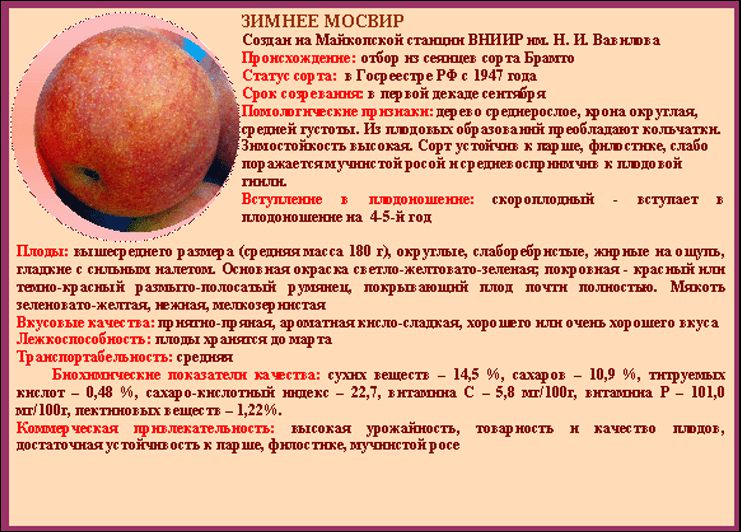 Сорт яблони Зимнее МОСВИР‚ выведенный на Майкопской опытной станции ВИР путем отбора сеянцев сорта Брамто‚ представляет собой среднерослое дерево с округло-раскидистой кроной средней густоты. Отличается высокой урожайностью и ранним вступлением в плодоношение. Плоды Зимнего МОСВИРа крупные‚ массой 200-280 г‚ хотя и не всегда выравненные по размеру‚ обладают округлой или округло-конической формой правильной геометрии. Интенсивная окраска плодов является характерной особенностью сорта. Более подробная информация о вкусовых качествах‚ химическом составе‚ устойчивости к заболеваниям и вредителям‚ а также сроках созревания и хранения требует дополнительных исследований и анализа доступных данных.