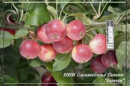 Плоды очень мелкие (21-35 гр), плоскоокруглой формы, гладкие. Кожица зеленовато-желтая, с размытым интенсивным пурпуровым румянцем на большей части плода и сильным голубым восковым налетом. Вкус кисло-сладкий, удовлетворительный. В них содержится. сахоров 11,1 (7,74-14,38), кислот 1,41 (1,03 1, 77), витамин С 16,5 (4,0 29,5) мг/, Р-активных соединений 191,0 296,0 мг/.